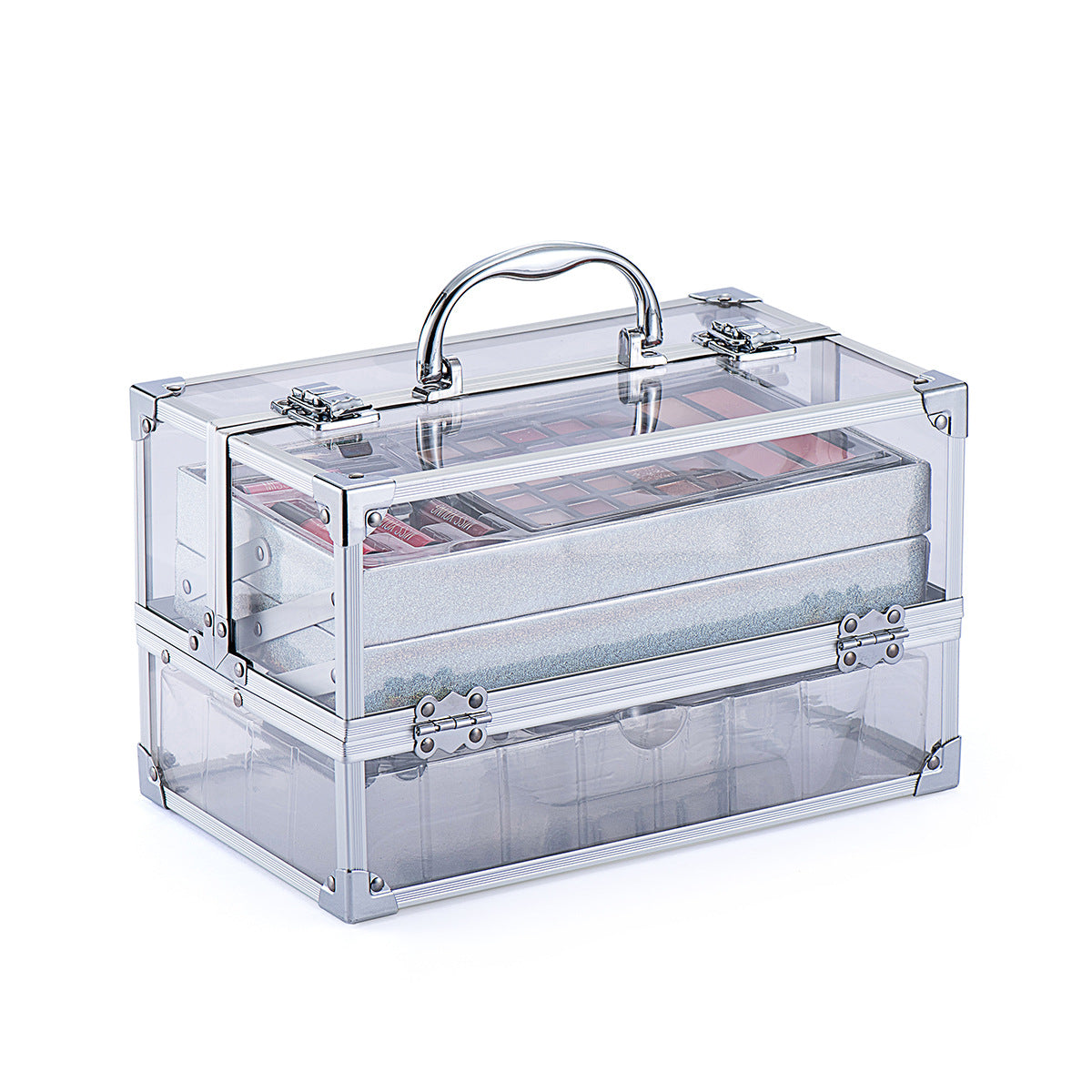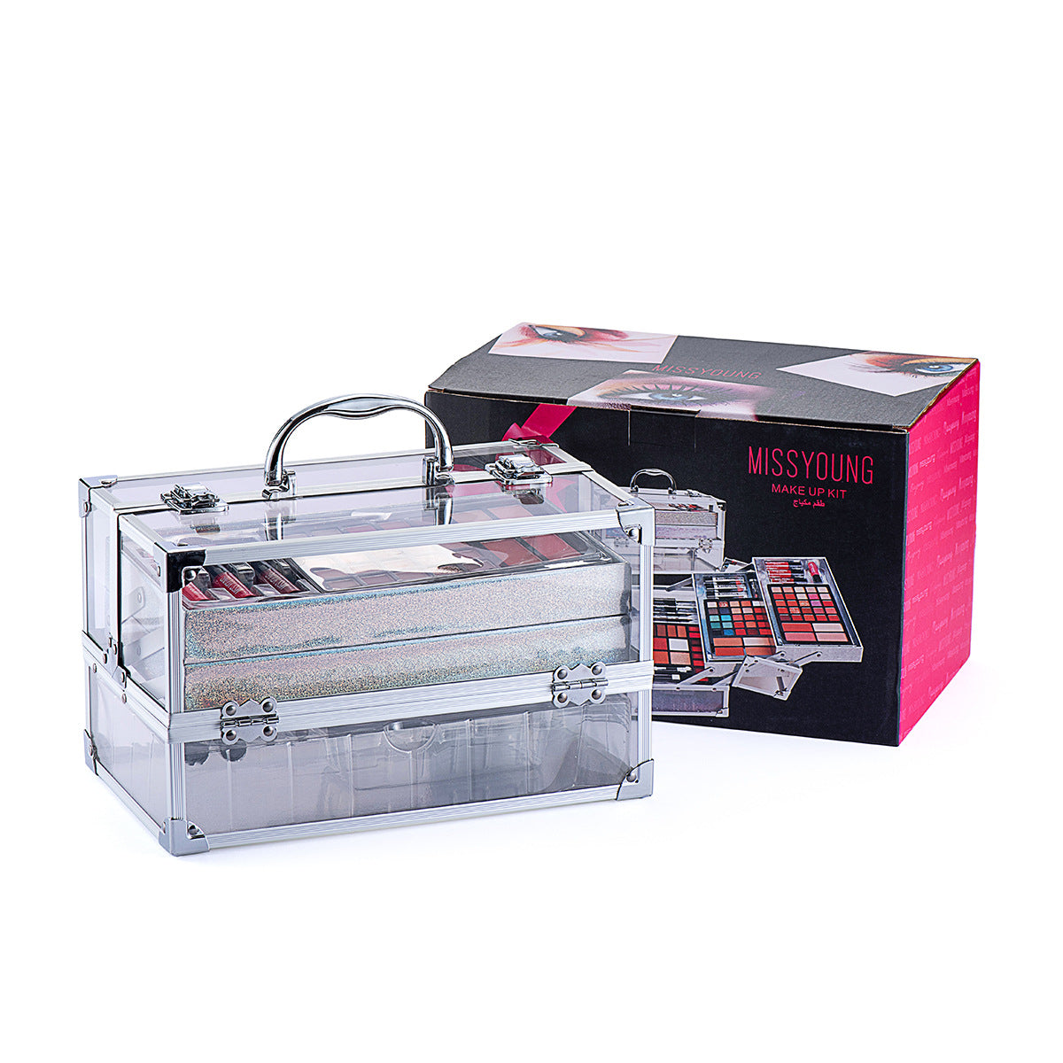 Set includes: lipstick, lip gloss, eye shadow, mascara, blush, lip pencil, brush, etc.