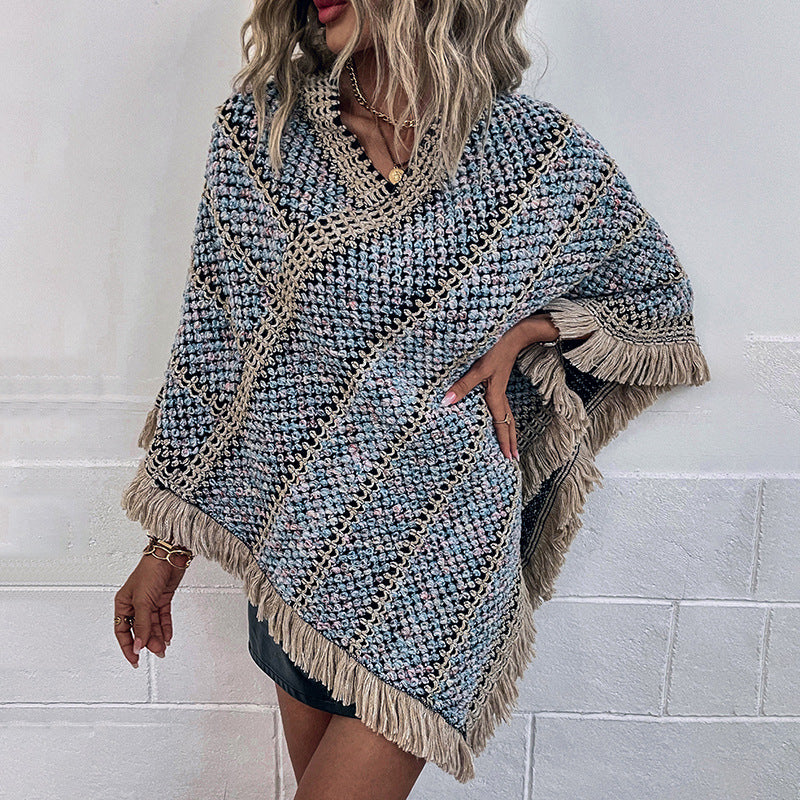 Contrast Color Striped Ethnic Style Tassel Pullover Cloak Shawl