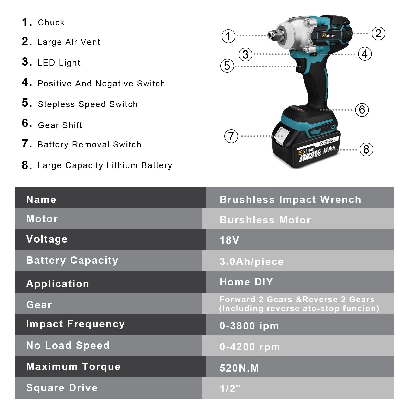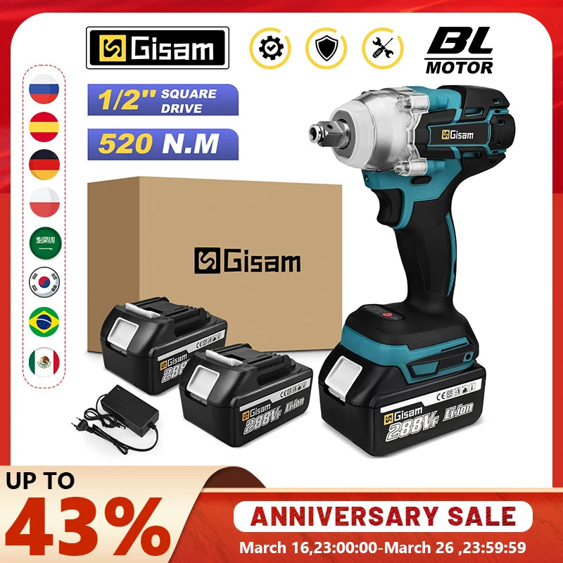 Gisam 520N.M Brushless Electric Impact Wrench Cordless Electric Wrench 1/2 inch for Makita 18V Battery Screwdriver Power Tools