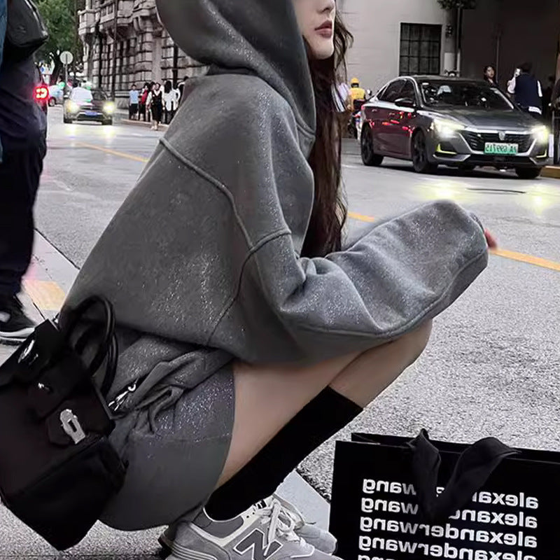 Gray Galaxy Thin And Glittering Hooded Fleece-lined Sweater